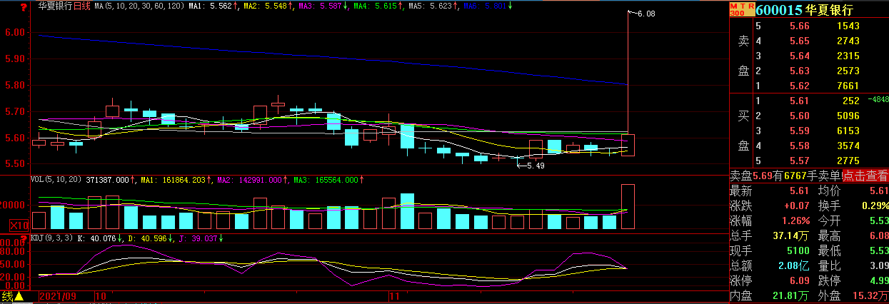 截至收盤,華夏銀行報價5.61元,漲幅1.26%。