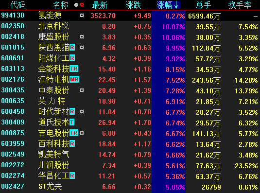 11月18日,氫能源概念股大面積飄紅,包括北京科銳、康盛股份、陜西黑貓等在內的5只概念股集體漲停,金能科技、中泰股份、英力特等個股也紛紛跟漲。