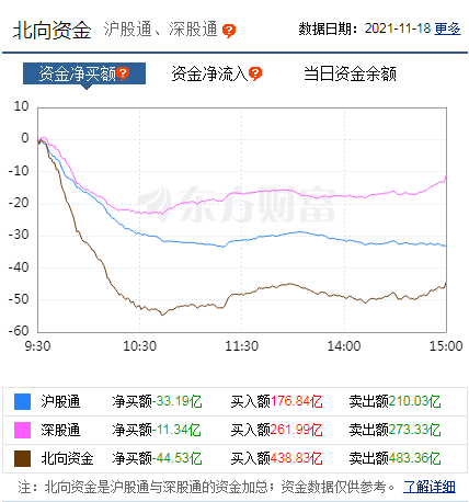 北向資金延續凈流出態勢,11月18日,北向資金凈賣出44.53億元,其中,滬股通凈賣出33.19億元,深股通凈買入11.34億元。