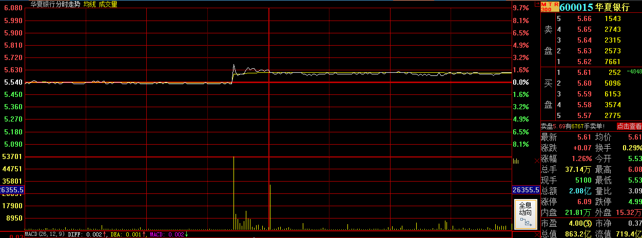 今日盤中,華夏銀行出現異動,在持續心電圖走勢時,于11點12分一筆5萬手的大單橫掃上方買單,讓華夏銀行股價沖至漲停價附近的6.08元,一分鐘不到隨即回落震蕩。