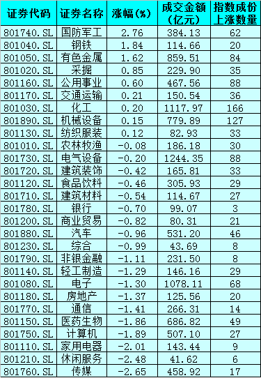 從申萬一級行業來看,有9個行業實現上漲,其中,國防軍工行業領漲,漲幅達到2.76%,鋼鐵和有色金屬等行業漲幅也均在1%以上,漲幅分別為1.84%、1.62%;另外,傳媒、休閑服務、家用電器等行業則震蕩走低,跌幅均超2%。