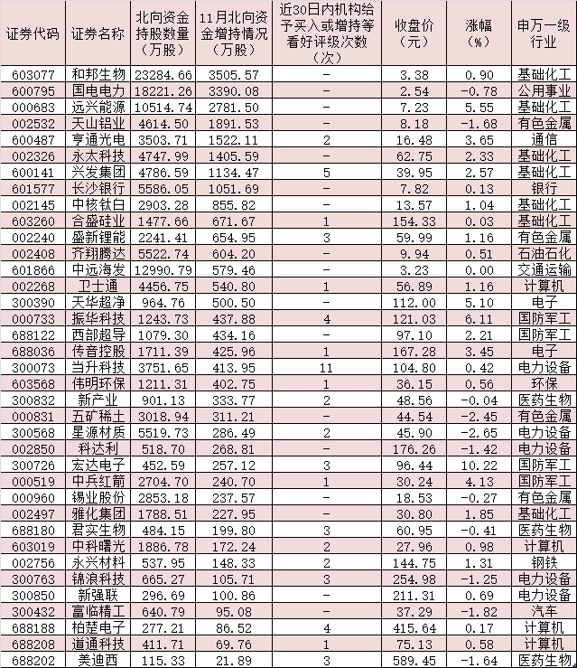 表:11月份獲北向資金增持的新納入MSCI中國A股指數(shù)成份股
