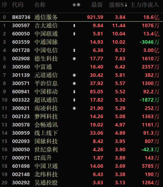 從早盤表現相對強勢的通信服務行業看,交易中的41只成分股中有40只上漲,其中,有2只封漲停板,另有10只個股漲幅超5%。資金方面,有18.6億元大單資金凈流入該行業,居各行業第4位。