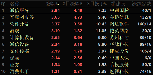 東方財富行業方面,截至3月1日11:30,86類行業中62類上漲,占比72.09%,其中,通信服務行業漲幅居首,達3.84%,此外,互聯網服務、軟件開發和游戲等行業漲幅也均超3%。下跌方面,光伏設備跌幅居首,達1.72%。