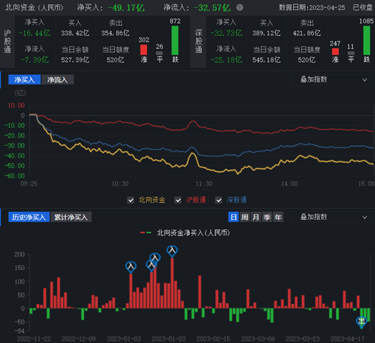 4月25日,A股繼續回落,滬指已連續5個交易日下跌,由于銀行股的上漲,減少了滬指下跌幅度,三大指數中滬指表現較強,深證成指和創業板指則均有1%以上的下跌。截至收盤,上證指數跌0.32%報3264.87點;深證成指跌1.48%報11149.01點,創業板指跌1.83%報2259.19點,A股合計成交額11352.08億元,較前一交易日增長4.68%,北向資金凈賣出49.17億元,滬股通凈買入-16.44億元,深股通凈買入-32.73億元。總體上看,A股中漲少跌多,有851只上漲,4230只下跌。