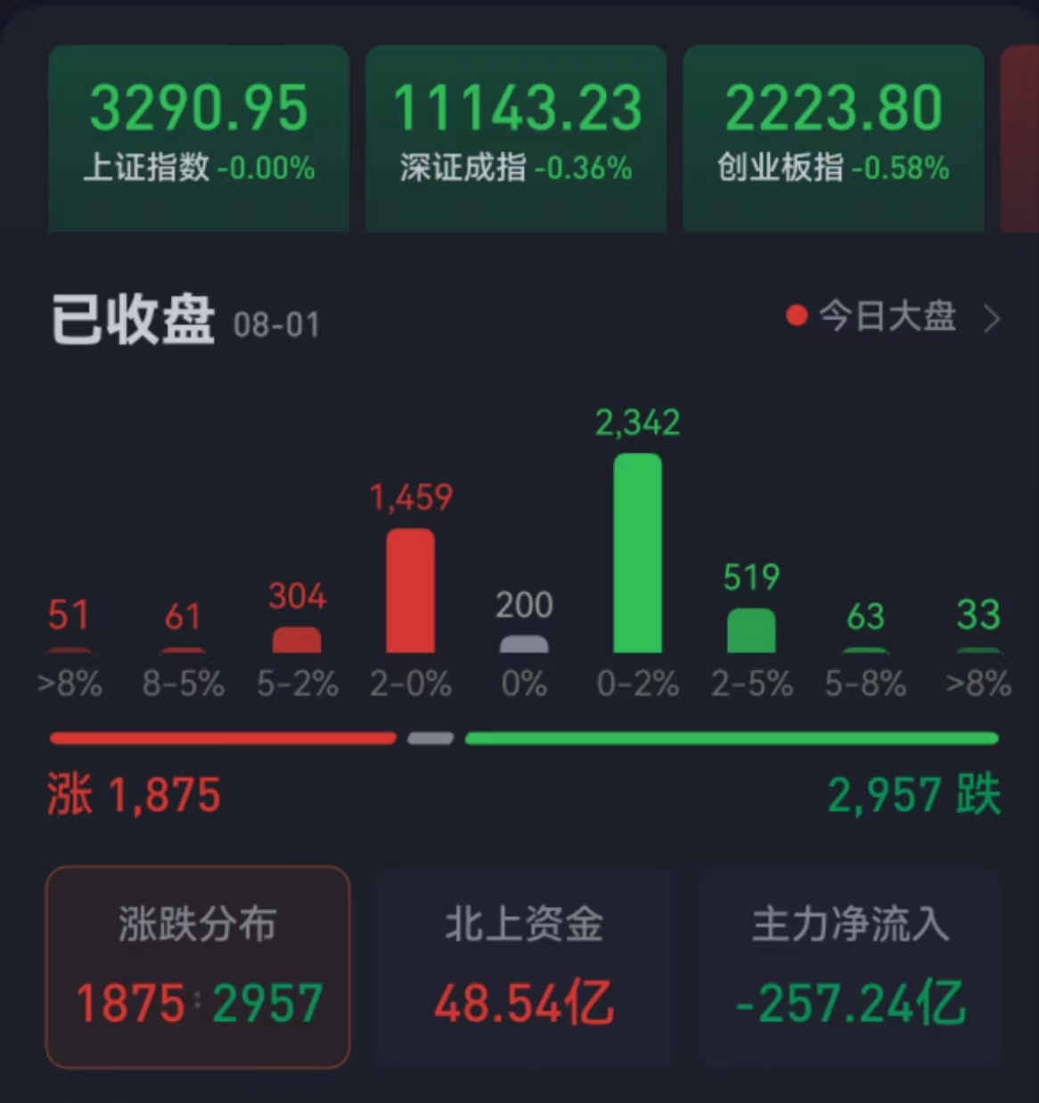 周二(8月1日),A股三大股指震蕩整理,略有回落。截至收盤(pán),上證指數(shù)微跌0.09點(diǎn)報(bào)3290.95點(diǎn),深證成指跌0.36%報(bào)11143.23點(diǎn),創(chuàng)業(yè)板指跌0.58%報(bào)2223.8點(diǎn),兩市合計(jì)成交金額達(dá)9566.78億元。北向資金凈買(mǎi)入48.54億元,連續(xù)6日凈買(mǎi)入,其中,滬股通凈買(mǎi)入48.18億元,深股通凈買(mǎi)入0.36億元。總體上看,兩市個(gè)股跌多漲少。其中,漲停個(gè)股達(dá)39只,跌停個(gè)股達(dá)3只。
