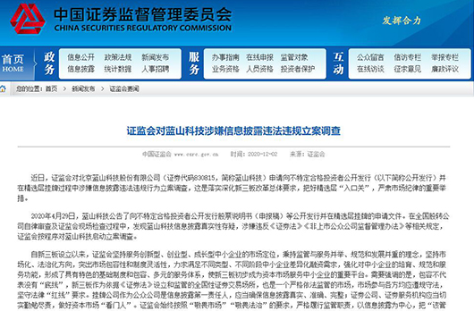12月2日,證監會表示,對北京藍山科技股份有限公司(以下簡稱藍山科技)申請向不特定合格投資者公開發行并在精選層掛牌過程中涉嫌信息披露違法違規行為立案調查。...>>詳情