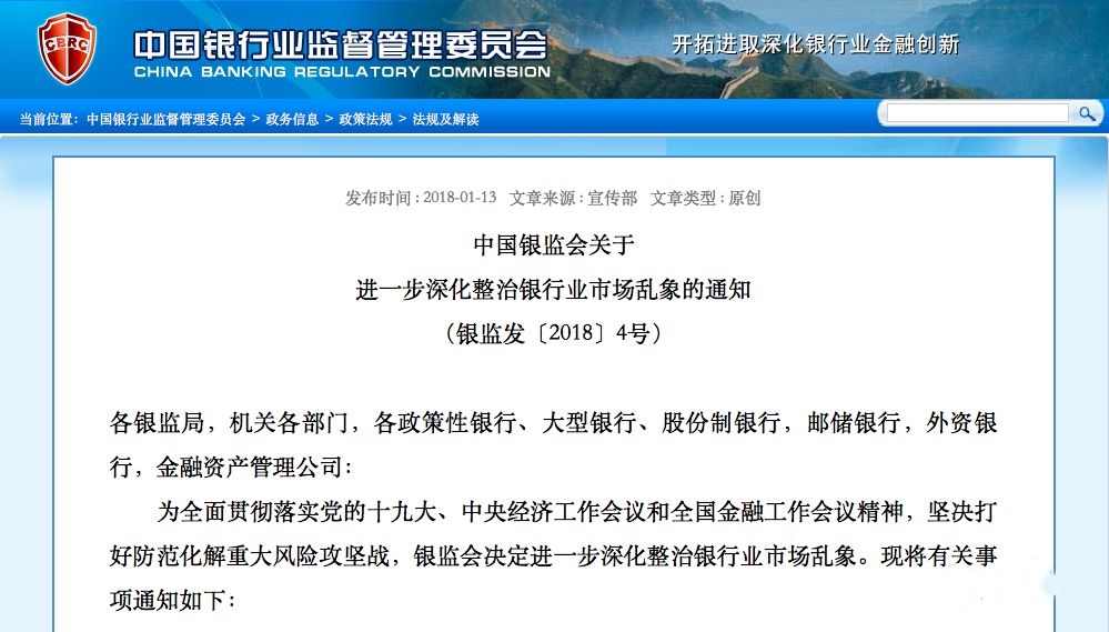 2017年,銀監(jiān)會(huì)組織開展了“三三四十”等一系列專項(xiàng)治理行動(dòng),下大力氣整治銀行業(yè)市場(chǎng)亂象,取得階段性成效,銀行業(yè)經(jīng)營發(fā)展呈現(xiàn)出積極變化,整體保持穩(wěn)中有進(jìn)的良好態(tài)勢(shì)。但是,整治銀行業(yè)市場(chǎng)亂象具有長期性、復(fù)雜性和艱巨性,是當(dāng)前及今后一段時(shí)期銀行業(yè)改革發(fā)展和監(jiān)管的一項(xiàng)常態(tài)化重點(diǎn)工作。 為全面貫徹落實(shí)黨的十九大、中央經(jīng)濟(jì)工作會(huì)議和全國金融工作會(huì)議精神,嚴(yán)守不發(fā)生系統(tǒng)性金融風(fēng)險(xiǎn)的底線,近日,銀監(jiān)會(huì)印發(fā)《關(guān)于進(jìn)一步深化整治銀行業(yè)市場(chǎng)亂象的通知》,在全國范圍內(nèi)進(jìn)一步深化整治銀行業(yè)市場(chǎng)亂象,切實(shí)鞏固前期專項(xiàng)治理成果,著力引導(dǎo)銀行業(yè)回歸本源、專注主業(yè)、做精專業(yè)、合規(guī)經(jīng)營、穩(wěn)健發(fā)展。