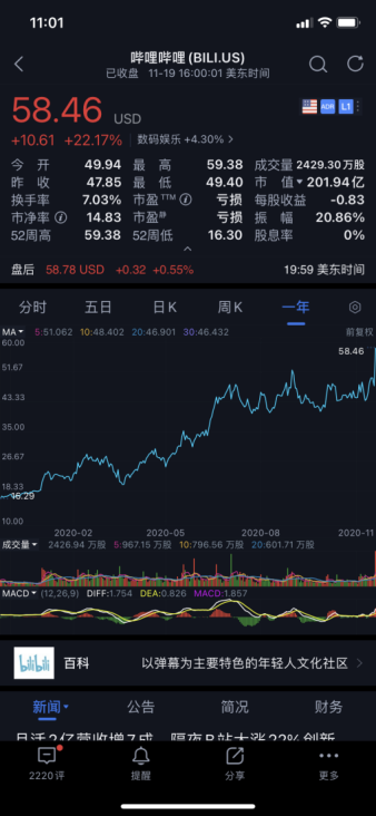 截至美東時(shí)間11月19日收盤,B站股價(jià)較前一交易日上漲22.17%,報(bào)58.46美元,創(chuàng)下歷史新高。2020年初至今,B站股價(jià)累計(jì)漲幅已超200%。目前,B站市值已突破200億美元。
