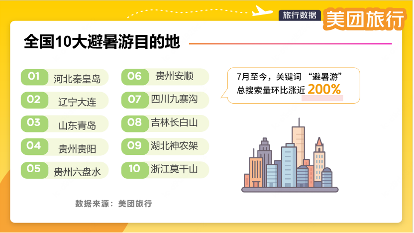 據(jù)美團(tuán)旅行數(shù)據(jù),今年夏天,Top10熱門避暑目的地分別為:河北秦皇島、遼寧大連、山東青島、貴州貴陽、貴州六盤水、貴州安順、四川九寨溝、吉林長(zhǎng)白山、湖北神農(nóng)架、浙江莫干山,熱門避暑清涼景區(qū)有清遠(yuǎn)古龍峽、青海湖二郎劍景區(qū)、霍山大峽谷漂流、婺女洲度假區(qū)、玉龍雪山國家風(fēng)景名勝區(qū)、潿洲島等,多個(gè)有漂流體驗(yàn)的景區(qū)都有上榜。