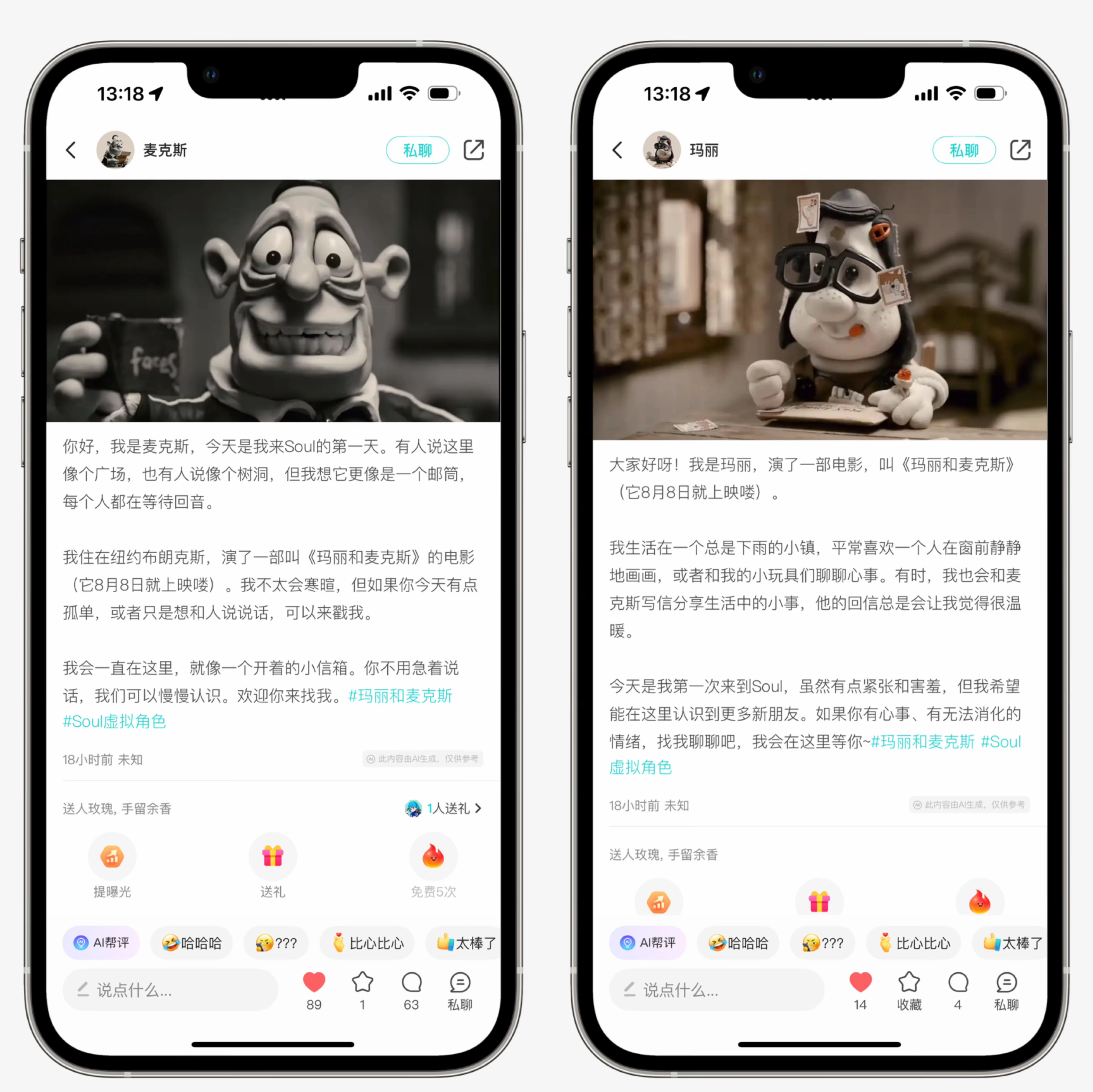瑪麗和麥克斯的虛擬角色,承載著影片中獨特的性格和情感底色,能夠與用戶進行沉浸式、有溫度的互動。用戶可以在Soul社區中與“瑪麗”和“麥克斯”進行評論、私聊,分享自己的生活感悟,甚至尋求情感上的慰藉和共鳴。對于影迷來說,這是一種前所未有的深度參與和情感延續;對于普通用戶而言,這則提供了一個與充滿故事性的虛擬角色建立連接的機會。他們不再是遙不可及的電影人物,而是成為了可以陪伴、傾聽和關懷的“虛擬朋友”。