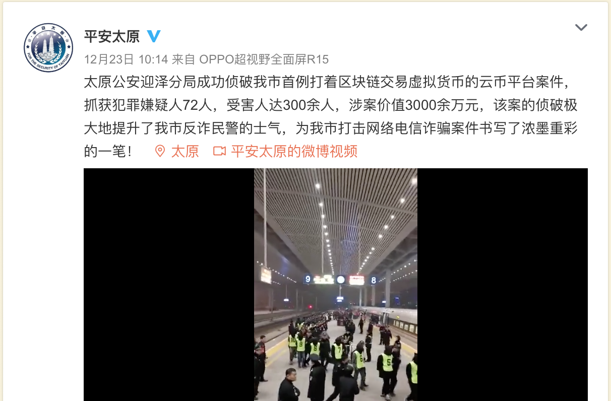 近日,山西省太原市公安局官方微博披露消息稱,太原公安迎澤分局成功偵破該市首例打著區塊鏈交易虛擬貨幣的云幣平臺案件,抓獲犯罪嫌疑人72人,受害人達300余人,涉案價值3000余萬元。