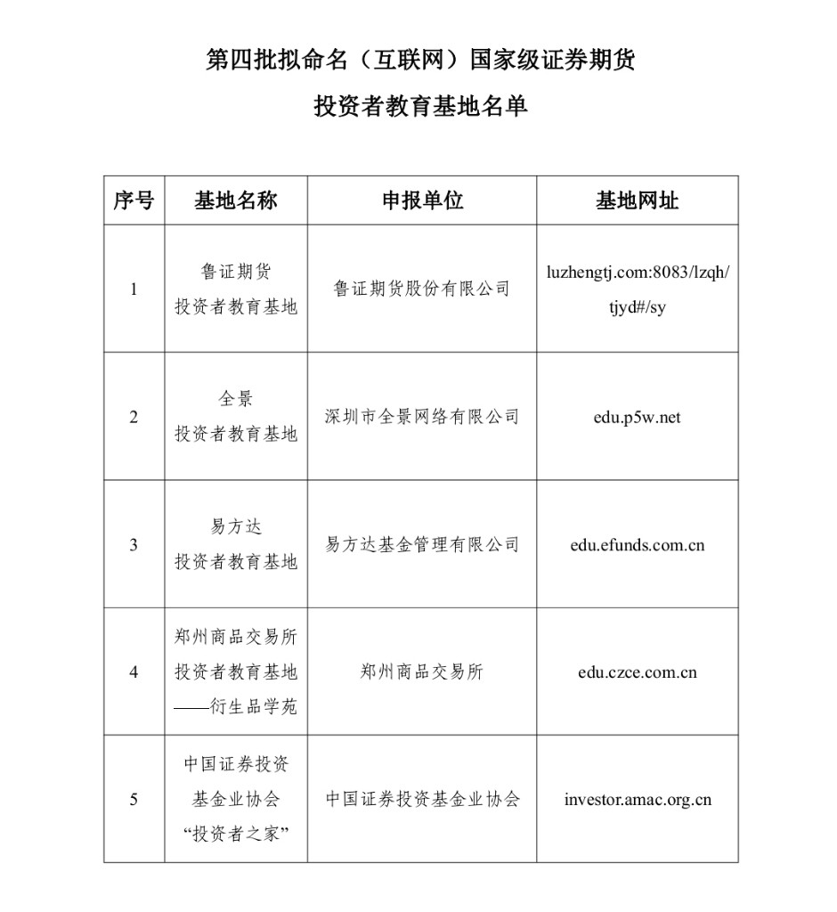 證監會網站7月16日消息,近日,證監會根據《關于加強證券期貨投資者教育基地建設的指導意見》(證監會公告〔2015〕23號)及《第四批證券期貨投資者教育基地申報工作指引》(證監會公告〔2020〕67號),開展了第四批國家級證券期貨投資者教育基地命名申報工作。依據相關規定,現將第四批擬命名國家級證券期貨投資者教育基地名單(見附件,按拼音首字母為序)進行公示。
