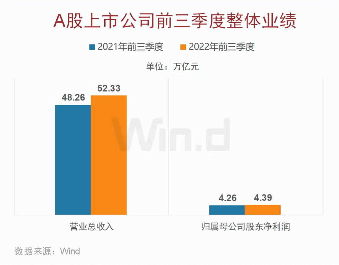 截至2022年10月30日晚,全部A股4973家上市公司,已有4963家披露2022年三季報數據。Wind數據顯示,2022年前三季度,A股上市公司合計實現營業總收入52.33萬億元,同比增長8.5%;合計實現凈利潤4.39萬億元。[詳細]